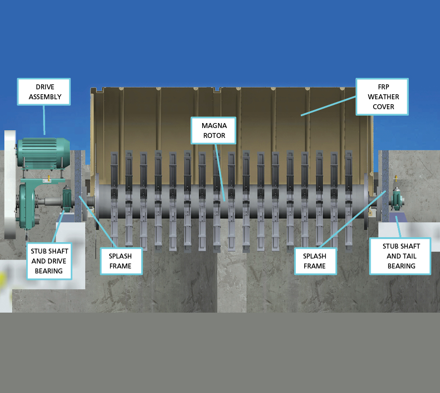 The Magna Rotor Aerator provides oxygen to the biological mass and mixes the microorganisms uniformly to prevent solids from settling in a biological treatment system. With excellent mixing capabilities, the Magna Rotor makes it possible to sustain high concentrations of microorganisms so that variations in organic loading and shock loads are easily absorbed by the system. The wide range of oxygen transfer allows the plant operator maximum flexibility to match the demand of the system. With the proper combination of speed and blade immersion, optimum performance can be maintained to match virtually any condition. Oxygen enrichment efficiency is further enhanced by the flow control baffles. Optimum performance of the Magna Rotor offers reliable operation, high efficiency and the lowest operating power cost throughout the life of the equipment.