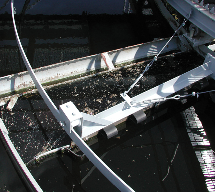 The Full-Surface Ducking Skimmer is an economical alternative to the Motorized Full-Surface Skimmer. The full surface skimmer, which is supported by the clarifier’s scraper arms, moves the floating material to the scum trough for removal. The skimmer supports are hinged to allow the skimmer to duck underneath the scum trough during the removal process.