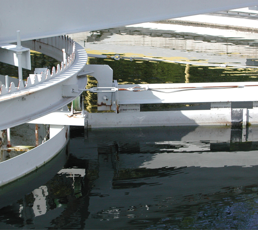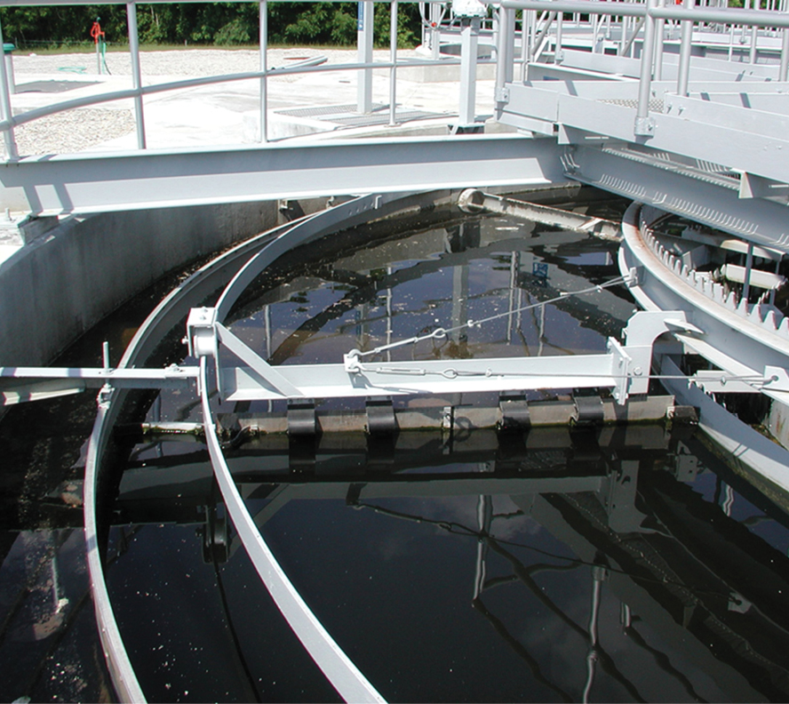 The Motorized Full-Surface Skimmer extends the full width of the clarifier surface, from the effluent trough scum baffle to the outer race skirt. A drive assembly rotates the skimmer arm to clean the clarifier surface, and a hinged blade suspended from the skimmer arm pushes floating material to a rotating scum trough for removal.