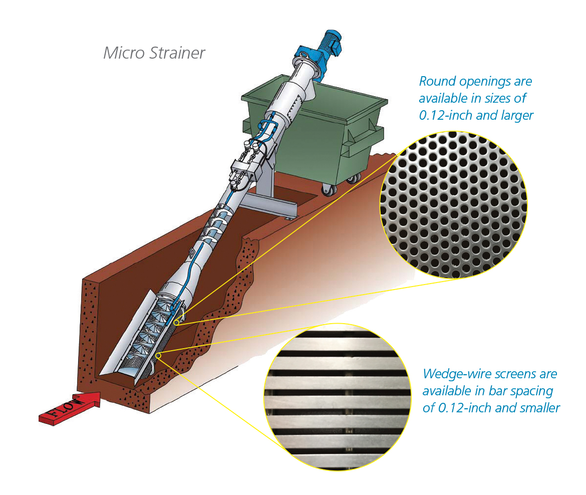 Ideal for small treatment facilities, the Raptor® Micro Strainer is a screen with a semi-circular basket with small apertures ranging from 0.04 to 0.25-inches (1 to 6 mm). It captures small debris that passes through other screens. A perforated plate or wedge wire basket is available for municipal or industrial applications. The captured screenings are washed, compacted, and dewatered to a dry solids content of 40 percent as they are transported up the inclined screw for disposal. This step reduces the volume by 50 percent and weight by 67 percent, ultimately reducing disposal costs.